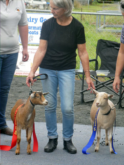 At Marburg Show today, we had a lovely day with a lovely group of people and some excellent results.  We took Ivydale China Doll (blue eyes/polled) who won her class and was then awarded Champion Doe Kid of the show and Reserve Champion ND Doe at just over 6 months of age!!!  Ivydale Cassia was 2nd to China Doll in her class.  FF Elliot won the Sire’s Progeny class and FF Carmen won the Dam’s Progeny Class so we are very proud of our little coloured goats!!
