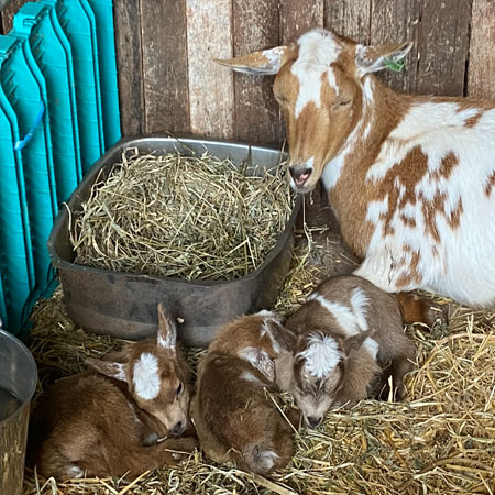 FF Betty kidded 5 last night but unfortunately, due to complications, only 2 survived – one buckling and one doeling.   They are both doing well.