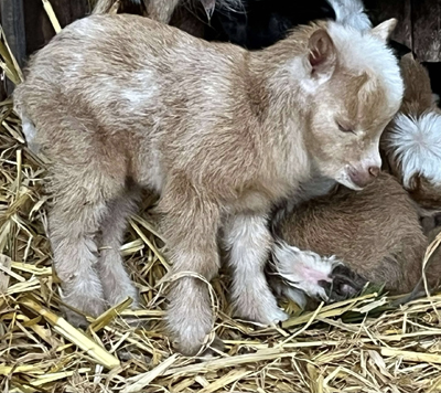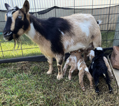 19 March Botanica kidded twins today and all three are doing well. I managed to get Botanica to take one of Bluebell’s kids which gives them triplets each to raise.